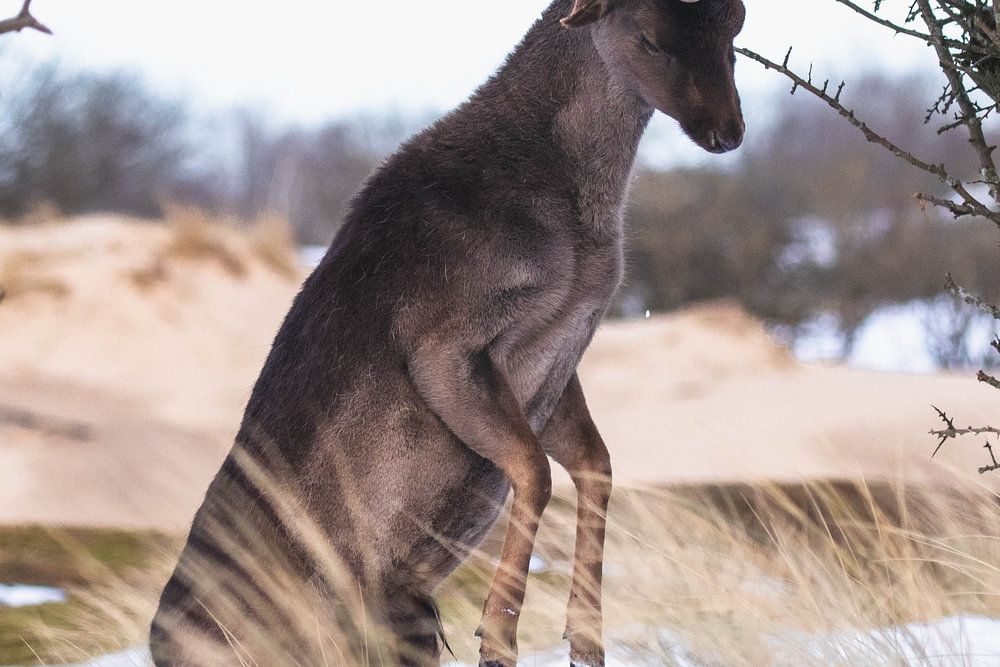 Steigerend damhert in de Amsterdamse Waterleidingduinen. In de sneeuw, winter 2021. Prachtig wit gekleurd duingebied.