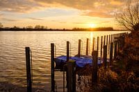 Steigers en boten aan het Schulensmeer in Lummen (België) tijdens zonsondergang.