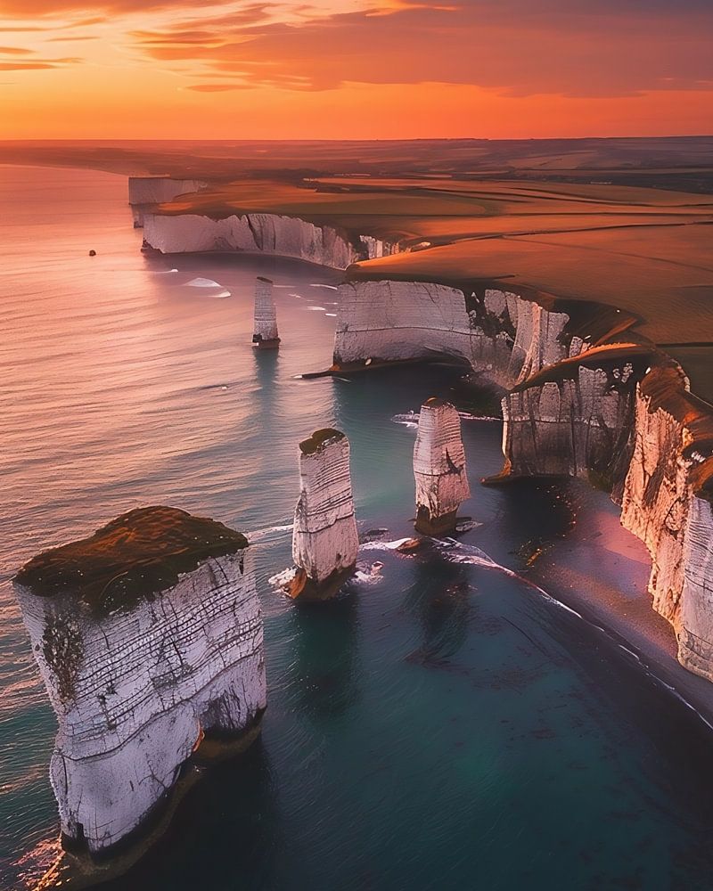 Steile kust gloeit in avondgoud