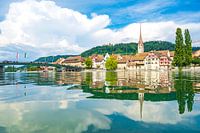 Rijn in Stein am Rhein, Zwitserland tijdens een mooie zomerdag. Een veerdienst vaart over de Rijn en de Untersse tussen Schaffhausen en Konstanz aan de oever van de Bodensee.