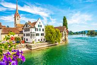 Rijn in Stein am Rhein, Zwitserland tijdens een mooie zomerdag. Een veerdienst vaart over de Rijn en de Untersse tussen Schaffhausen en Konstanz aan de oever van de Bodensee.