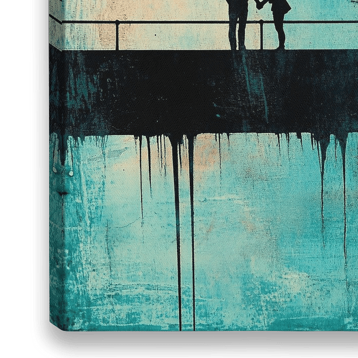 Dit bijzondere kunstwerk vangt de aandacht met een krachtige silhouet van een stel dat hand in hand staat op een brug, omringd door een dromerige achtergrond van verweerde kleuren. De mix van turquoise, zwart en oranje straalt een unieke sfeer uit, waarbij contrast en emotie samenkomen. Perfect om een modern interieur te verrijken, dit…