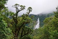 Om bij de Doubtful Sound te komen, moesten we over de Wilmot Pass Road rijden. We stopten bij verschillende uitkijkpunten, waarvan er een dit uitzicht gaf op Stella Falls vanuit de verte. We hielden ook van de met mos bedekte boomtakken.