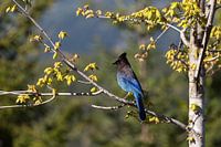 De prachtige vogel Stellers Gaai. Een opvallend blauwe vogel met een donkerblauw kopje en kuif.