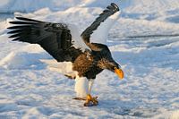 Stellers zeearend met een vis als prooi voor het diner op het drijvende ijs in de Nemuro-zeestraat een paar mijl ten noordoosten van Rausu op Hokkaido, Japan.