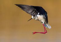 Steltkluut in vlucht, landend in een meertje, tegen egale bruine achtergrond.