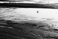 Steltlopers, tureluurs, waden tijdens de eb op het zand van de Waddenzee.