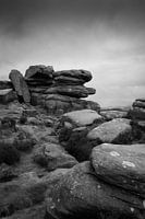 Een druilerige regenachtige dag op Millstone Edge bij Hathersage in het Peak District National Park, Derbyshire, Engeland. De interessante rotsformaties maken deel uit van het landschap in dit populaire wandelgebied. Zwart-wit reisfotografie