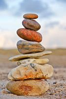 Een toren van stenen gestapeld op het strand aan de Noordzeekust in Denemarken.