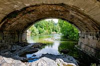 Een oude stenen boogbrug in Cangas de Onis in Spanje overspant een kalme rivier, omgeven door levendige groene vegetatie en een rotsachtige omgeving, en legt de schoonheid van de natuur en de historische architectuur vast.