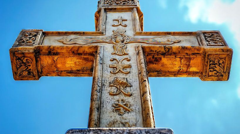 Het kikkerperspectief toont een sierlijk versierd stenen kruis tegen een helderblauwe lucht. De gedetailleerde gravures en de verweerde structuur symboliseren de duurzaamheid van het christelijk geloof en spiritualiteit.
