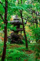 Stenen lantaarn tussen de bomen in een Japanse tuin. Met mos op de grond en Japanse esdoorns eromheen voor een knusse sfeer. Herfstkleuren op de achtergrond, groen in de voorgrond.