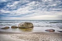 Meditatie op het noordelijk strand van Rügen. Prachtige grote stenen in harmonie op het strand met golven en een opwindende hemel op de achtergrond