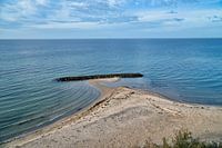 Stenen groyne steekt in zee op een zandstrand in Denemarken. Grote stenen op het zandstrand in Denemarken aan zee. Aan de kust van Denemarken. Landschapsfoto in Denemarken