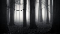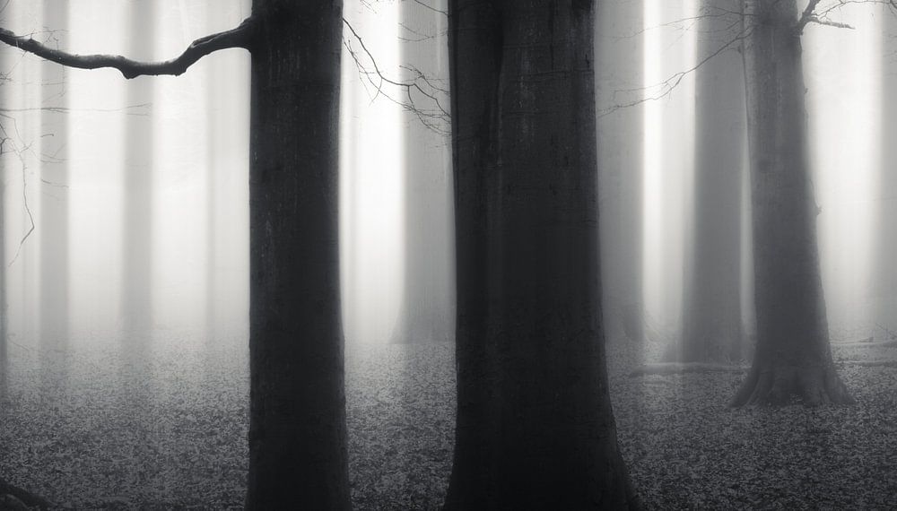 Mysterieus, griezelig bos gehuld in dichte mist, geïnspireerd op de gotische kunst, Lord of the Rings en black metal. Heilooërbos, Nederland (2018)