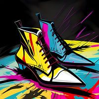 "Step into the Art" is een uitnodigend kunstwerk dat de toeschouwer meeneemt op een kleurrijke en creatieve reis. Dit levendige popart werk vangt de verbeelding met twee schoenen die centraal staan in een explosie van kleur en verf.