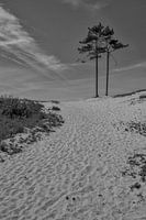 Dit werk toont een fotogenieke duinheuvel in de Kennemerduinen. Het witte zand toont voetstappen naar de top waar 2 Corsicaanse dennen de wacht houden.