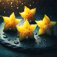 "Starfruit Wonder" is een betoverend stukje digitale kunst gemaakt door een moderne voedselstylist die de sterfruit, of carambola, in een heel nieuw licht presenteert. De vrucht is afgebeeld in helder geel en groen en elke plak is versierd met sprankelende waterdruppels die lijken te dansen in het licht en het beeld vullen met een surrealistische vitaliteit.