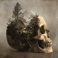 Dit is een ingewikkelde microkosmos waar anatomie en aarde elkaar ontmoeten, waar vanitas en natuur elkaar ontmoeten.'". Een menselijke schedel is versmolten met een levensecht wildernislandschap, met hoge naaldbomen en grillige bergtoppen in contrasterende kleuren. De verweerde afwerking en gedempte kleuren geven dit werk een…