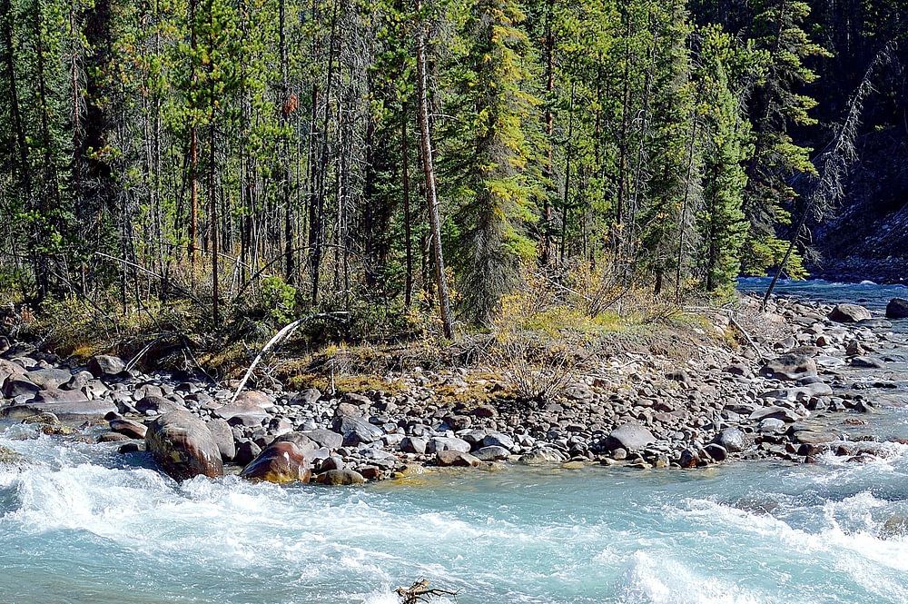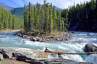 Sunwapta Falls is een van de vele watervallen langs de Icefields Parkway in Alberta, Canada. Het was geweldig om te zien hoe dit kleine eiland met bomen sterk staat in de stroomversnellingen.