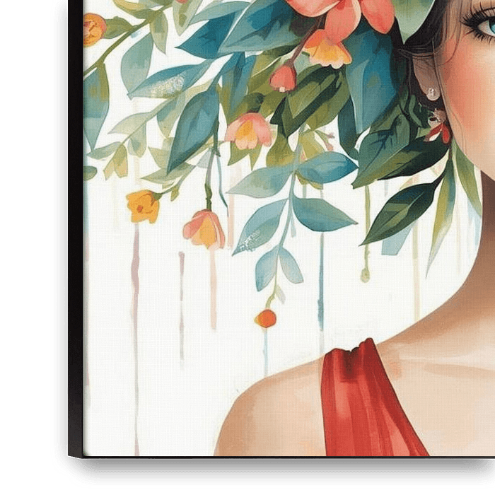 Een zacht en vriendelijk bloemenportret met een mooie vrouw getooid met een weelderige kroon van bloeiende bloemen en frisgroene bladeren. De harmonieuze mix van pastelroze, warme sinaasappels en kalmerend groen creëert een zachte, opbeurende sfeer. Haar serene uitdrukking en heldere ogen roepen een gevoel van warmte, vrouwelijkheid en…