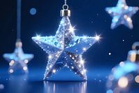 Het motief toont stralende kerststerren met fijne glitter op een diep donkerblauw als stijlvolle achtergrond, ontworpen als een hoogwaardige 3D-rendering voor feestelijke toepassingen. Verschillende sterren van verschillende grootte zweven ruimtelijk voor het oppervlak; hun oppervlakken zijn gefacetteerd of licht gebogen en weerkaatsen…