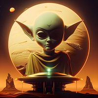 Deze afbeelding toont een sterelf tegen de achtergrond van een planeet met Afrofuturistisch geïnspireerde elementen zoals felle kleuren en futuristische ontwerpen. Een randlicht omringt de figuur met een halo, wat zijn silhouet benadrukt en een surrealistische sfeer creëert. De cyberpunk iconografie voegt een vleugje technologische en dystopische elementen toe aan de scène, wat resulteert in een visueel verbluffende en betoverende compositie.