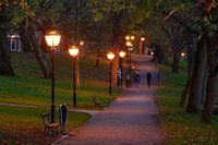 De focus ligt op het eerste bankje en de lantaarnpaal ernaast. De rest van de foto is (bewust) minder scherp.