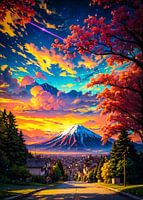 Een kosmische nachtelijke hemel gloeit over de berg Fuji en een rustig Japans stadje, omlijst door kersenbloesems en levendige wolken bij zonsondergang. Dit surrealistische kunstwerk mengt aardse schoonheid met kosmische verwondering. De berg Fuji staat hoog, besneeuwd en majestueus, terwijl de straten van een Japans stadje eronder…