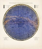 Kleurenkaart uit ca. 1900 van de sterren aan de noordelijke hemel. Hierop afgebeeld de tekens van de dierenriem (sterrenbeelden). Wij hebben ook een versie zonder overslagvel met tekst beschikbaar.