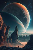 Deze pakkende sciencefictionillustratie toont een eenzame figuur die op een ruig, rotsachtig terrein staat, overzien door kolossale planeten in een met sterren bezaaide hemel. Ruige bergtoppen rijzen op rond de figuur, terwijl nevelflarden door diepe, schaduwrijke valleien drijven, waardoor een beklemmend, surreëel buitenwerelds…
