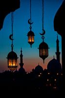In een mystiek spel van licht en schaduw ontvouwen zich kunstzinnig vormgegeven lantaarns, glinsterend in zachte gouden tinten. Het fascinerende silhouet van de horizon op de achtergrond doet denken aan traditionele architectuur onder een diepblauwe hemel. Dit kunstwerk geeft elke woonkamer een warme, uitnodigende sfeer vol oosterse elegantie.