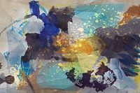 Kleurrijk schilderij in blauw, geel, goud, beige.
