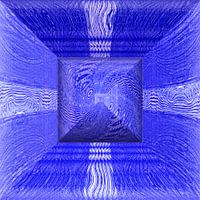 Sierkunst: Piramide in een kubus met gloeiende oneindige sterrensporen in een draaikolk op een blauwe achtergrond