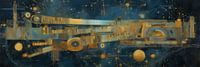 Dit werk vangt de essentie van een futuristisch industrieel complex in de ruimte. De compositie is een combinatie van blauwe en gouden tinten, die de indruk wekken van een geavanceerd ruimtevaartuig of een technologisch knooppunt zwevend tussen de sterren. De gedetailleerde geometrische vormen en gestructureerde patronen geven het…