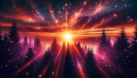 De foto toont een adembenemende scène waarin de kijker wordt meegevoerd naar een wereld tussen droom en werkelijkheid. Centraal staat een spectaculaire zonsopgang of zonsondergang, waarvan de intense oranje en rode tinten in schril contrast staan met de donkere voorgrond. De zon straalt stralen uit die door de mist breken en de silhouetten van de talrijke dennenbomen verlichten. Deze bomen staan symmetrisch opgesteld en benadrukken de diepte van de foto. Een fantastisch samenspel van roze, violette en blauwe kleuren strekt zich uit tussen de lucht en de aarde, doet denken aan een sterrenstelsel en geeft de kijker het gevoel getuige te zijn van een magische gebeurtenis. Fonkelende sterren en kosmisch stof lijken dichtbij genoeg om aan te raken en geven de foto een bijna surrealistische kwaliteit. De combinatie van natuurlijke en kosmische elementen maakt het werk tot een visueel feest voor de zintuigen en stimuleert de verbeelding.