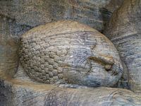 Stervende of slapende Boeddha, Gal Vihara, Sri Lanka. Het moment waarop Boeddha de staat van verlichting bereikt. Granieten sculptuur uitgehouwen uit de wand en 14 m. lang. Een laantje langs een waterbekken leidt naar de Gal Vihara, de beroemde rotstempel met vier enorme uit de granieten rots gehouwen beelden uit het midden van de 12de eeuw. In de rotswand zijn inscripties aangebracht. Oorspronkelijk maakte de rotstempel deel uit van een kloostercomplex uit de tijd van Parakrama Bahu i, het Uttararama (noordelijk klooster).