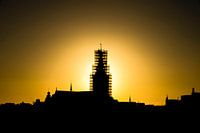 Zonsopkomst in Nijmegen. De toren van de Sint Stevenskerk staat in de steigers. De haan is gerestaureerd en terug geplaatst.