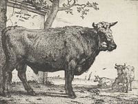 Blaarkop stier, met op de achtergrond twee koeien, waarvan één wordt gemolken. Mooie gedetailleerde tekening.