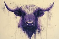 Dit indrukwekkende portret van een stier is uitgevoerd in krachtige paarse tinten, die zowel mysterie als majesteit uitstralen. De intense blik, gecombineerd met de gedetailleerde textuur van de vacht en hoorns, roept een gevoel van vastberadenheid en oerkracht op. De achtergrond is dynamisch opgebouwd met druipende verfstreken, waardoor het beeld zowel rauw als artistiek aanvoelt. Deze moderne interpretatie van dierlijke kracht is een echte eyecatcher voor elk interieur met een gedurfde, expressieve stijl.