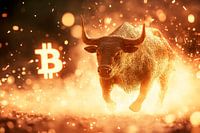 Een krachtige stier breekt door gloeiende vonken en symboliseert kracht en groei. Het Bitcoin-symbool schittert op de achtergrond en belichaamt de moderne financiële geest. Deze dynamische afbeelding is perfect voor een kantoor, waar het inspireert en motiveert tot zakelijk succes.