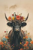 "Stier in de Bloemenoase" vangt de verbluffende contrasten van de natuur - de robuuste, kalme uitstraling van de stier tegenover de speelse en levendige bloemen die hem omringen. Het spel van licht en schaduw op het gezicht van de stier versterkt de textuur en diepte van het kunstwerk. Deze afbeelding zou een rustgevende en toch krachtige aanvulling zijn op elke ruimte, perfect voor zowel moderne als landelijke interieurs.