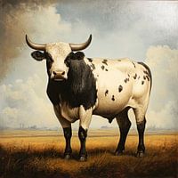 Dit werk laat een stier zien die stevig en zelfverzekerd in een uitgestrekt landschap staat. De lucht is zacht bewolkt en de horizon toont subtiel een landelijke omgeving met gebouwen in de verte. De compositie is klassiek, met een centrale focus op het dier, die direct de aandacht trekt.
