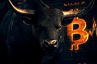 Koop de foto Stier tegen Bitcoin-achtergrond - Financiën van Poster Art Shop op canvas, aluminium dibond, (ingelijste) fotoprint, behang en ArtFrame, op maat geprint in Fine-Art kwaliteit.