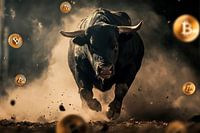 Te midden van wervelende stofwolken sprint een imposante stier vol energie en dynamiek. Gouden munten dansen om hem heen en symboliseren de snelle groei van de cryptowereld. Deze krachtige afbeelding brengt levendigheid in elk kantoor, inspireert tot nieuwe ideeën en maakt een sterke indruk tijdens vergaderingen. Ideaal voor iedereen die de economische pols wil voelen.