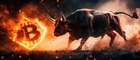 Een krachtige stier omringd door laaiende vlammen belichaamt de explosieve dynamiek van de cryptowereld. Het gloeiende Bitcoin-symbool straalt vastberadenheid en innovatie uit. Deze afbeelding is perfect voor een modern kantoor, waar het inspiratie biedt voor creatieve ideeën en gedurfde beslissingen - een symbool van groei en zin in…