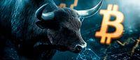 Een krachtige stier breekt door de duisternis en symboliseert kracht en groei, terwijl gouden Bitcoin-symbolen oplichten op de achtergrond. Deze afbeelding straalt dynamiek en vooruitdenken uit, ideaal voor een modern kantoor of creatieve werkplek waar inspiratie en financiële ambitie worden aangemoedigd. Een echte blikvanger voor alle cryptoliefhebbers!