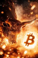 Een krachtige stier, omringd door gloeiende vonken en een stralend Bitcoin-symbool, straalt dynamiek en energie uit. Deze indrukwekkende weergave van kracht en groei is een blikvanger en ideaal voor een modern kantoor of creatieve werkplek. Perfect om inspiratie en vastberadenheid aan te moedigen!