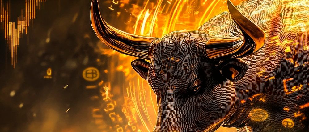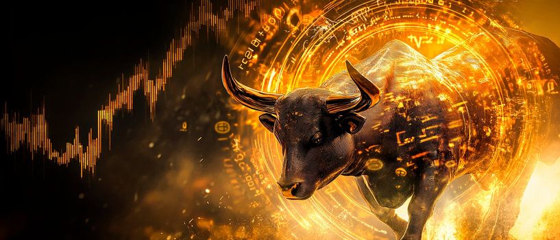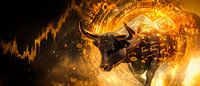 Een krachtige stier, omringd door gloeiend goud en dynamische cijfers, staat voor kracht en financiële dynamiek. De energieke lijnen en futuristische glamour geven de afbeelding een opwindende sfeer. Perfect voor een kantoor of studeerkamer, het inspireert tot voorspoed en passie in zakelijke inspanningen.