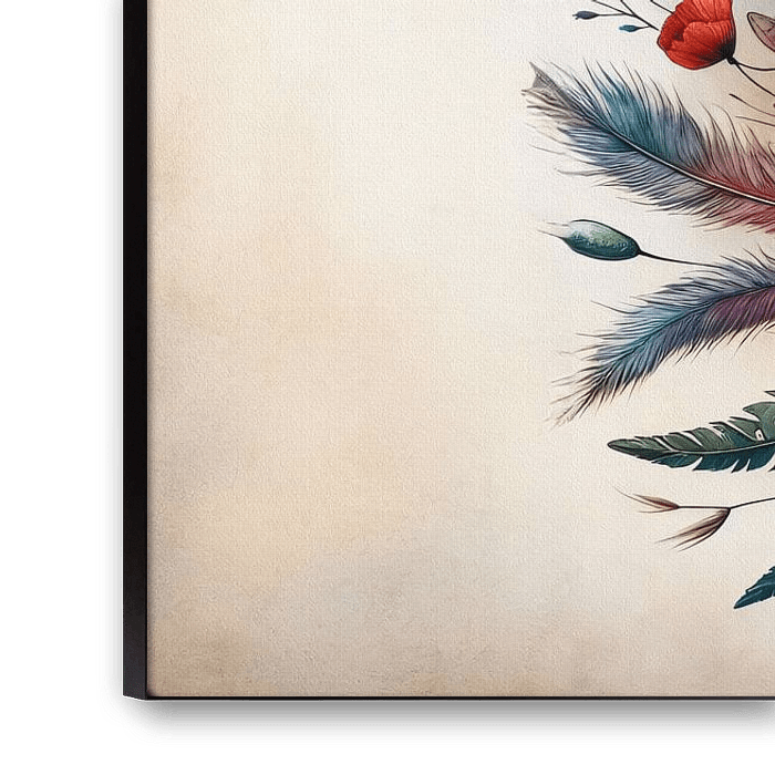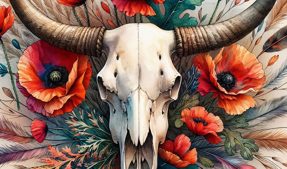 Buffelschedel (Bull Skull) geflankeerd door twee grote, gebogen hoorns en omringd door een verscheidenheid aan klaprozen in oranje en rode tinten. Verschillende groene bladeren en veren worden ook afgewisseld tussen de bloemen, waardoor een weelderige compositie ontstaat. De achtergrond is beige van structuur en doet denken aan oud papier of perkament. Artistieke AI weergave van natuurlijke elementen in een evenwichtige en esthetisch aangename compositie die vaak wordt geassocieerd met thema's van leven en dood in de kunst.